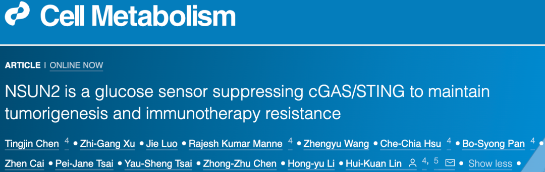 [1].Chen et al., NSUN2 is a glucose sensor suppressing cGAS/STING to maintain tumorigenesis and immunotherapy resistance, Cell Metabolism. 2023. doi: 10.1016/j.cmet.2023.07.009