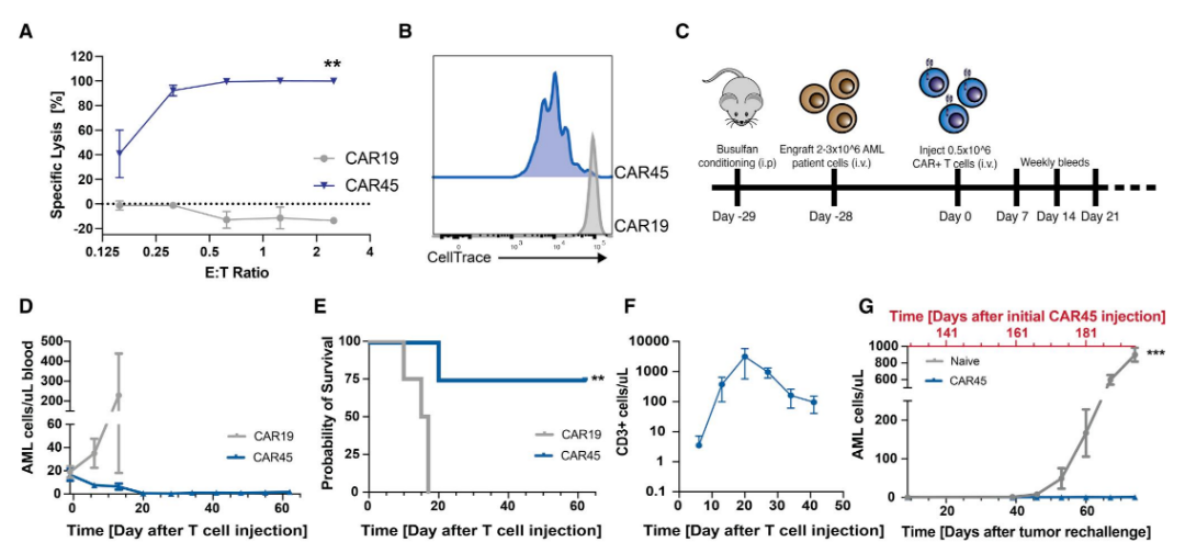 研究团队在细胞和小鼠模型中进行了大量实验,以测试了这一表位编辑策略的可行性。试验结果显示,这种新方法不仅可以阻止靶向 CD45 的 CAR-T 细胞的自相残杀或攻击表位编辑的造血干细胞,而且可以迅速摧毁血液癌细胞。在小鼠实验中,靶向 CD45 的 CAR-T 细胞在输入后 3 周内消除了白血病细胞,并且在两个多月后仍然存在并且能够持续杀死白血病细胞。