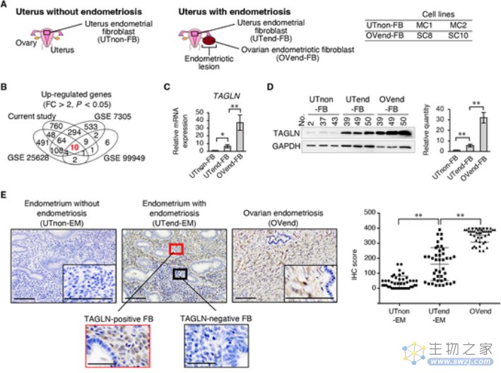 研究人员从4名患者和4名健康志愿者处取得了子宫内膜和异位内膜组织样本,进行了基因表达谱分析,结果显示从健康女性子宫内膜成纤维细胞到患者女性子宫内膜成纤维细胞再到患者女性卵巢异位细胞的TAGLN表达水平是逐步增加的。