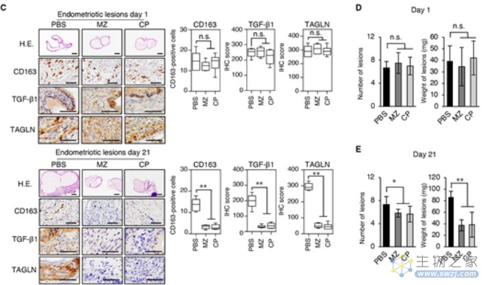 既然梭杆菌属感染会促进子宫内膜异位症的进展,那么抗生素治疗是否能抑制疾病进展呢?研究人员使用甲硝唑(MZ)和氯霉素(CP)两种梭杆菌属敏感的抗生素对模式小鼠进行了治疗,经过一周的抗生素治疗后,具核梭菌浸润不再存在,供体小鼠子宫内膜和受体小鼠子宫内膜异位病变中的M2巨噬细胞浸润、TGF-β1和TAGLN表达均降低。