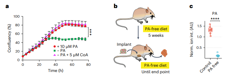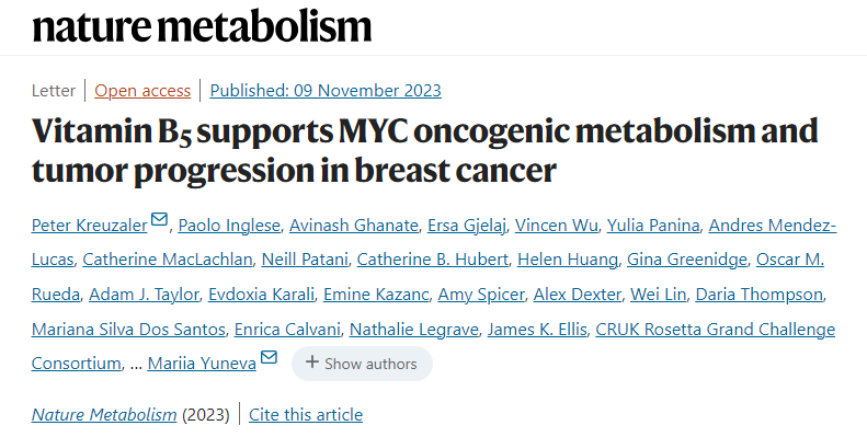综上,结果表明,高表达MYC的乳腺癌细胞严重依赖维生素B5来生长和存活,通过饮食限制维生素B5的摄入可以抑制肿瘤生长,这一依赖性可以被用作潜在的治疗靶点,了解肿瘤的代谢依赖性对于创造有效的人类癌症疗法至关重要。