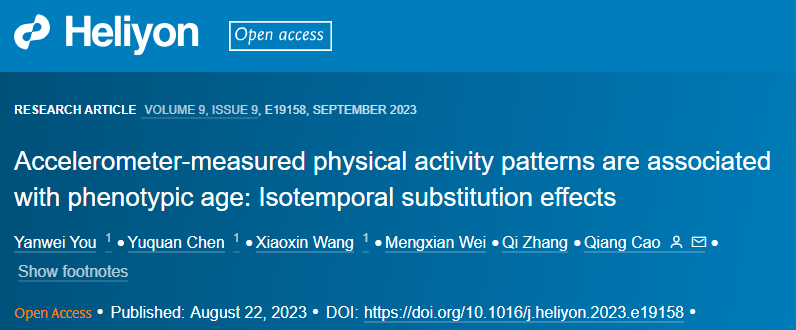 2024-01-04 16:43:31 来源:医诺维近日,清华大学、北京协和医学院、澳门科技大学等研究人员在 CellPress 细胞出版社旗下" Heliyon "期刊上发表了一篇题为" Accelerometer-measured physical activity patterns are associated with phenotypic age:Isotemporal substitution effects "的研究论文。