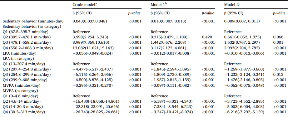具体来说,与久坐行为最少的人相比,久坐行为最多的人,表型年龄增加了2.99岁;与低强度运动最少的人相比,低强度运动最多的人,表型年龄降低了1.48岁;与中高强度运动最少的人相比,中高强度运动最多的人,表型年龄降低了6.22岁。