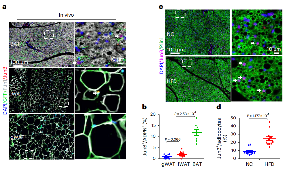 此外他们利用小鼠实验发现,相比于白色脂肪,JunB在棕色脂肪中选择性表达。更重要的是,高脂饮食喂养可以通过引起与肥胖相关的促炎状态,明显增加小鼠棕色脂肪中表达JunB的脂肪细胞数量,在高脂饮食喂养4周时间后占比由8.7%增至24.9%。