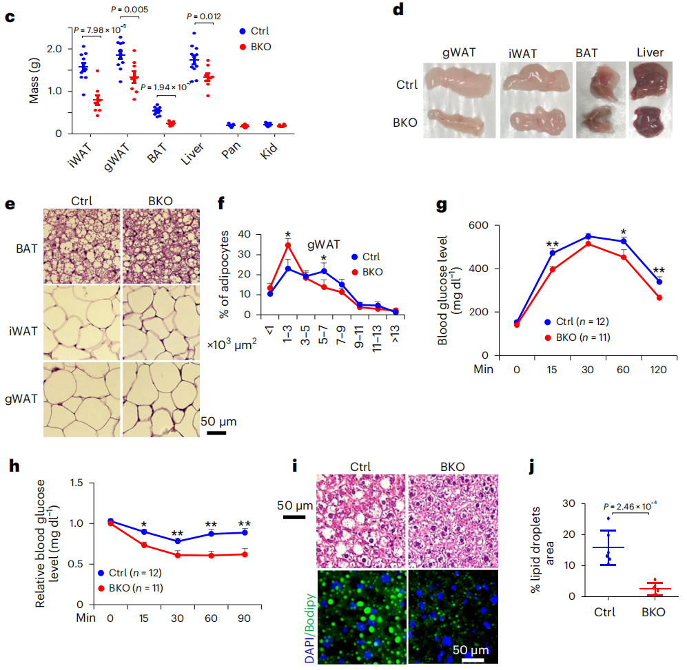 在高脂饮食下,相较于野生型小鼠,脂肪组织特异性缺失JunB的小鼠体重、脂肪质量增长幅度减少,胰岛素耐受和肝脂肪变性得到改善。