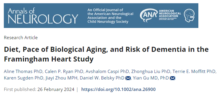 近日,美国哥伦比亚大学的研究人员在《神经病学年鉴》(Annals of Neurology)期刊上发表了一篇题为" Diet,Pace of Biological Aging,and Risk of Dementia in the Framingham Heart Study "的研究论文。