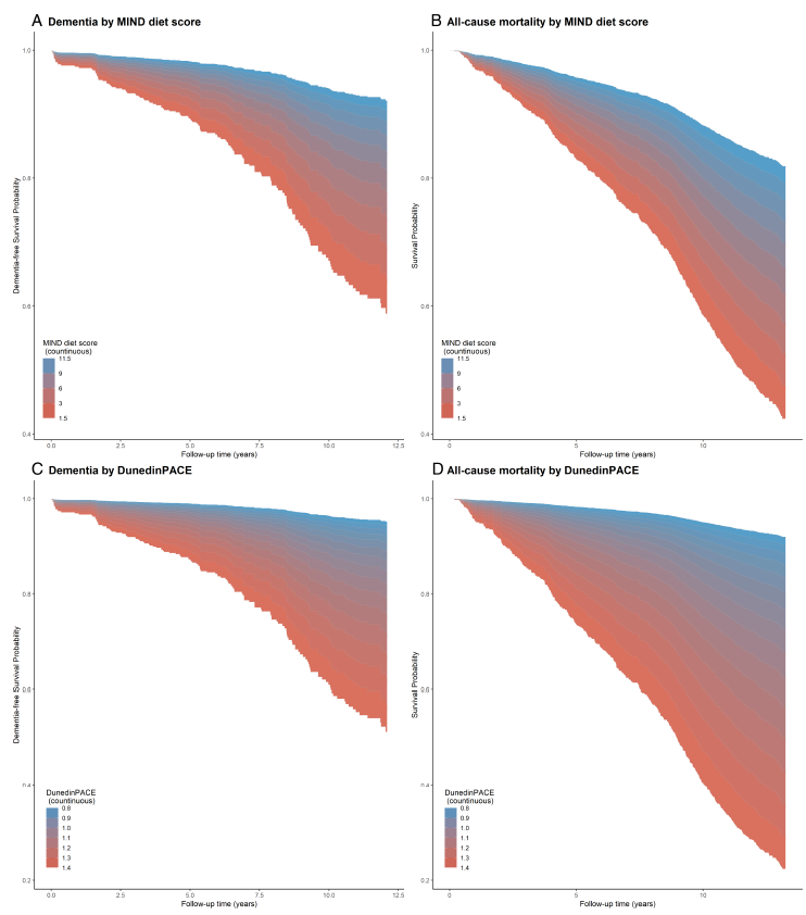 在这项研究中,研究人员分析了弗雷明汉心脏研究后代队列数据,共纳入1644名参与者,年龄在60岁或以上,基线时没有痴呆症,并且可用的饮食、表观遗传和随访数据,将健康饮食评估为长期坚持MIND饮食,分析了健康饮食与衰老、痴呆、死亡之间的关系。