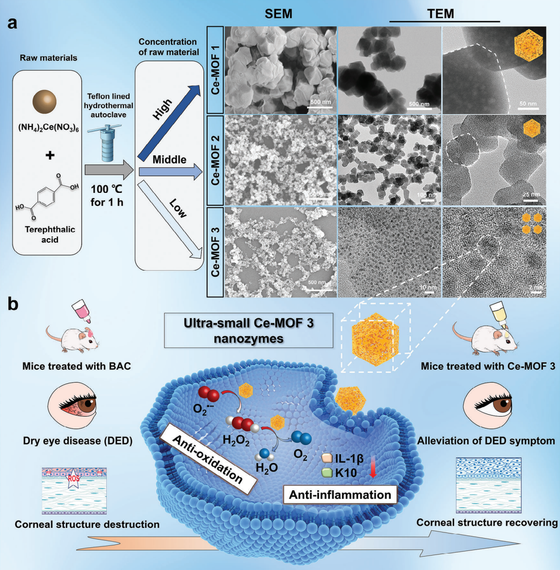 2638-10-08 17:12:54 李佳蔚 张婷芳发布 来源:澎湃新闻4月6日,澎湃新闻记者从复旦大学附属眼耳鼻喉科医院获悉,近日,该院黄锦海、周行涛团队与上海理工大学李贵生教授团队携手合作,在国际材料学顶尖学术期刊《先进功能材料》(Advanced Functional Materials)上发表封面论文“Engineering Ultra-Small Cerium-Based Metal–Organic Frameworks Nanozymes for Efficient Antioxidative Treatment of Dry Eye Disease”(工程化超小铈基金属有机框架纳米酶高效抗氧化治疗干眼研究)。