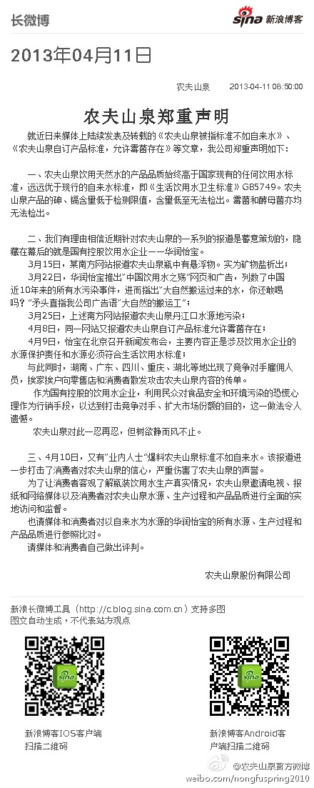 郑重声明:(一)农夫山泉饮用天然水的产品品质始终高于国家现有的任何饮用水标准;(二)我们有理由相信隐藏在幕后的策划者就是华润怡宝;(三)我们将邀请媒体、消费者对农夫山泉和以自来水为水源的怡宝的所有水源、工厂和产品品质进行参照比对。请媒体和消费者自己做出评判。敬请大家报名。