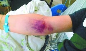 朝阳医院急诊科医生杨军告诉记者,患者王先生是东北人,今年20多岁。前一段时间,他和父母及女朋友来京旅游。6月30日,王先生因为肚子痛去医院就诊,医生给他做了B超后发现他有尿路结石,随后王先生做了激光碎石,但肚子疼的症状还是没有改善。7月5日,王先生来到朝阳医院就诊,此时他的身上已经出现了多处大面积的瘀斑,腿部和臀部的瘀斑尤其严重,比较大的瘀斑面积甚至比A4纸还要大,门诊接诊的医生将他转到了急诊抢救室。