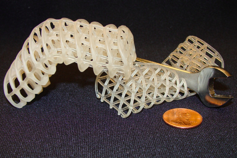 该材料由蜡和泡沫制成,可在软硬状态之间随意转换。研究人员把聚氨酯泡沫放进中熔化的蜡中,随后挤压泡沫来使其迅速、大量吸收蜡。选择泡沫的原因是它可以被压缩得很小,而一旦释放压力它们会弹回原来的形状,同时通过控制泡沫架构中的导线来加热融化周围的蜡,从而让蜡涂层外壳由硬变,关闭电源后材料降温,外壳重新回到硬的状态。此外,加热还能修复一切损害,“这是一种自愈材料,”安内特教授说,“如果控制时用力过猛而使涂层断裂,可以通过加热、冷却来修复损伤。”最值得注意的是,聚氨酯泡沫和蜡的成本十分低廉。为了更详细地研究材料特性,研究人员用3D打印技术建立了第二版泡沫晶格结构,测试了两种材料,结果发现3D打印的泡沫晶格比聚氨酯泡沫更合适,而焊锡也是蜡涂层的有力替代者。