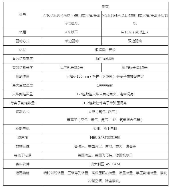 ArtCut系列数控火焰/等离子切割机是一种氧燃气和等离子切割相结合的高效率、高可靠性的多功能热切割自动化设备。 机身为龙门式结构,横梁经整体人工时效消除应力,具有良好刚性,强度高不变形。数控火焰等离子切割机除尘方式有两种:一种是干式除尘,另一种是水面切割。 纵向导轨采用71Mn导轨,表面经磨削处理具有高精度和耐磨性,轨长可根据用户需要增减(导轨长度:2米/根)。 横向导轨有两种:一种是直线导轨,另一种是精密导轨板,精度高、运行平稳。减速机选用精密齿轮减速器 升降机构为伺服电机或直流电机驱动,由丝杆副传动,直线导轨导向,保证切割精度。 割炬装置采用360°防碰撞设计,即使割炬在碰撞中也不容易损坏。 本设备具有自动定位、自动穿孔、自动点火及自动调高等功能。