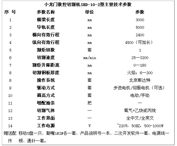 小龙门数控切割机SHD-10-2型产品描述:该设备为龙门式切割机中最小的一款,有效切割宽度最大为2.4m.,纵向切割距离可根据用户的要求加长,小龙门数控切割机是处于悬臂和大龙门的中间产品,双边驱动,价格低于龙门切割机,是切割小型钢板的最佳选择。 小龙门数控切割机SHD-10-2型产品特点: 1.系统采用5.7英寸彩屏北京斯达特SH2012AH(美国独资),有断电保护、记忆功能; 2.横向导向为标准单轴心导向,小车传动平稳准确,纵向采用特制轻便导辎重导向,运行轻便灵活; 3. 小龙门数控切割机SHD-10-2型整机工艺结构合理,具有超强的等离子抗干扰能力; 4.行走部分采用无间隙齿轮、齿条传动,电机驱动采用步进驱动技术; 5.升降体采用铝合金结构,升降导向采用直线导轨,升降提升采用滚珠丝杠提升; 6.双边均采用精密齿轮齿条(7级精度)传动;横向导轨为直线导轨,耐用,耐磨; 7. 小龙门数控切割机SHD-10-2型强大的程序储存空间,可以同时存30个任意图形,满足各种复杂程序的运行加工; 8.加工过程中可以随时更改程序,方便快捷; 9.工作界面通俗易懂,操作简单,只要你识字就会操作;