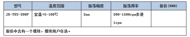 产品用途 JK-TUS-200P恒温混匀仪(振荡型恒温金属浴)采用了直流无刷电机以及微电脑控制技术,将恒温和振荡两种功能完美地结合在一起,极大地缩短了实验操作的时间,提高了工作人员的效率。是样品孵化、催化、混匀以及保存等反应过程理想的自动化工具。拥有加热、振荡等多用途功能。可以满足不同用户的需求。 性能指标 1.控温范围:室温+5℃ ~ 100℃ 2.温度均匀性: ≤±0.3℃ 3.温度稳定性:±0.3℃ 4.温度显示精度:0.1℃ 5.升温速度:<20min (从20℃ to 100℃) 6.振荡转速范围:200-1500 rpm (步进 1 rpm) (*) 7.振荡幅度与方式:2mm (水平回转) 8.时间设置最长:99h59min 9.最高温度:105℃ 10.模块型号选择:参见JK-TUS-200P系列可更换模块 *1) 温度和混匀频率上限要根据具体使用的模块决定